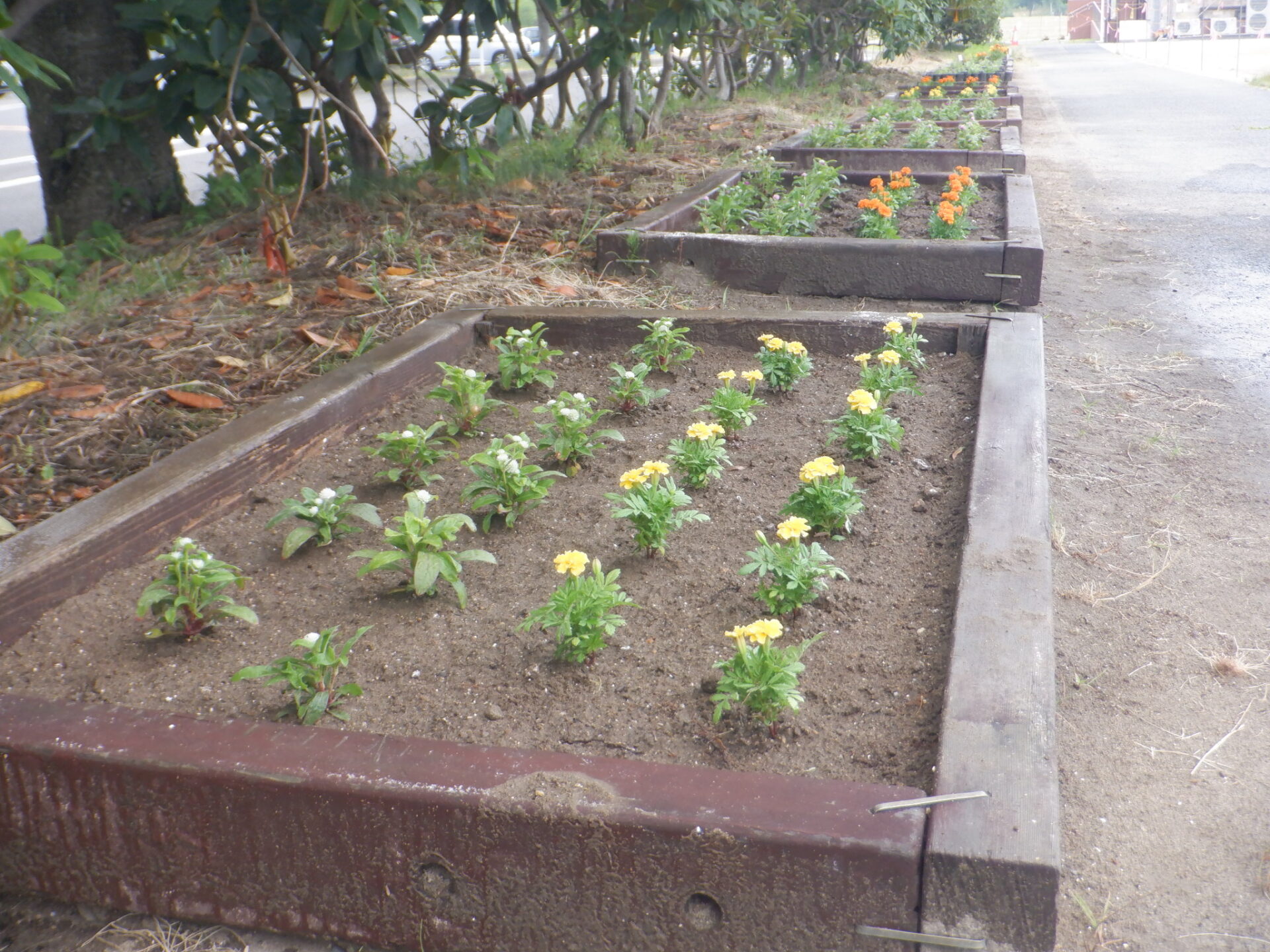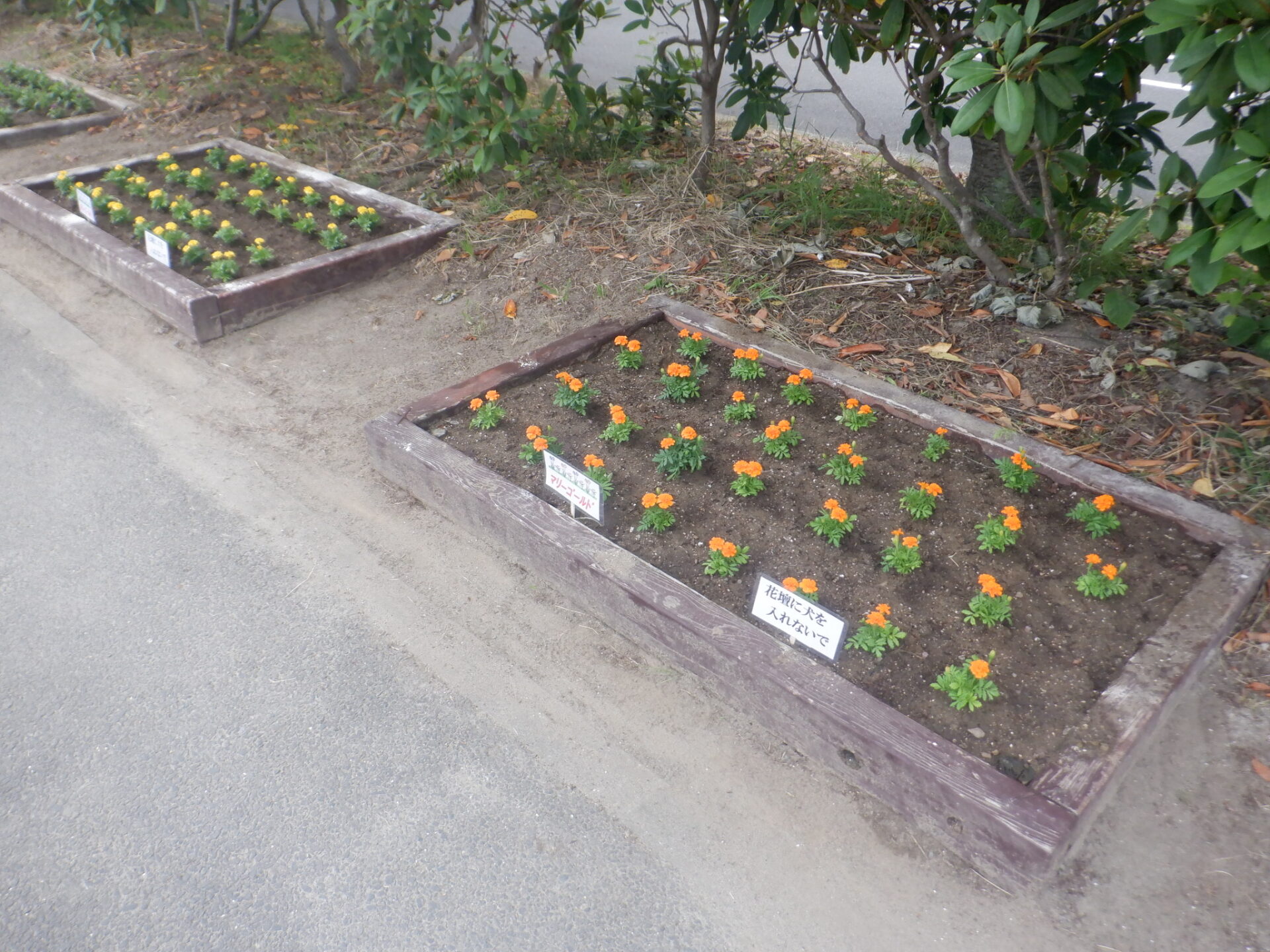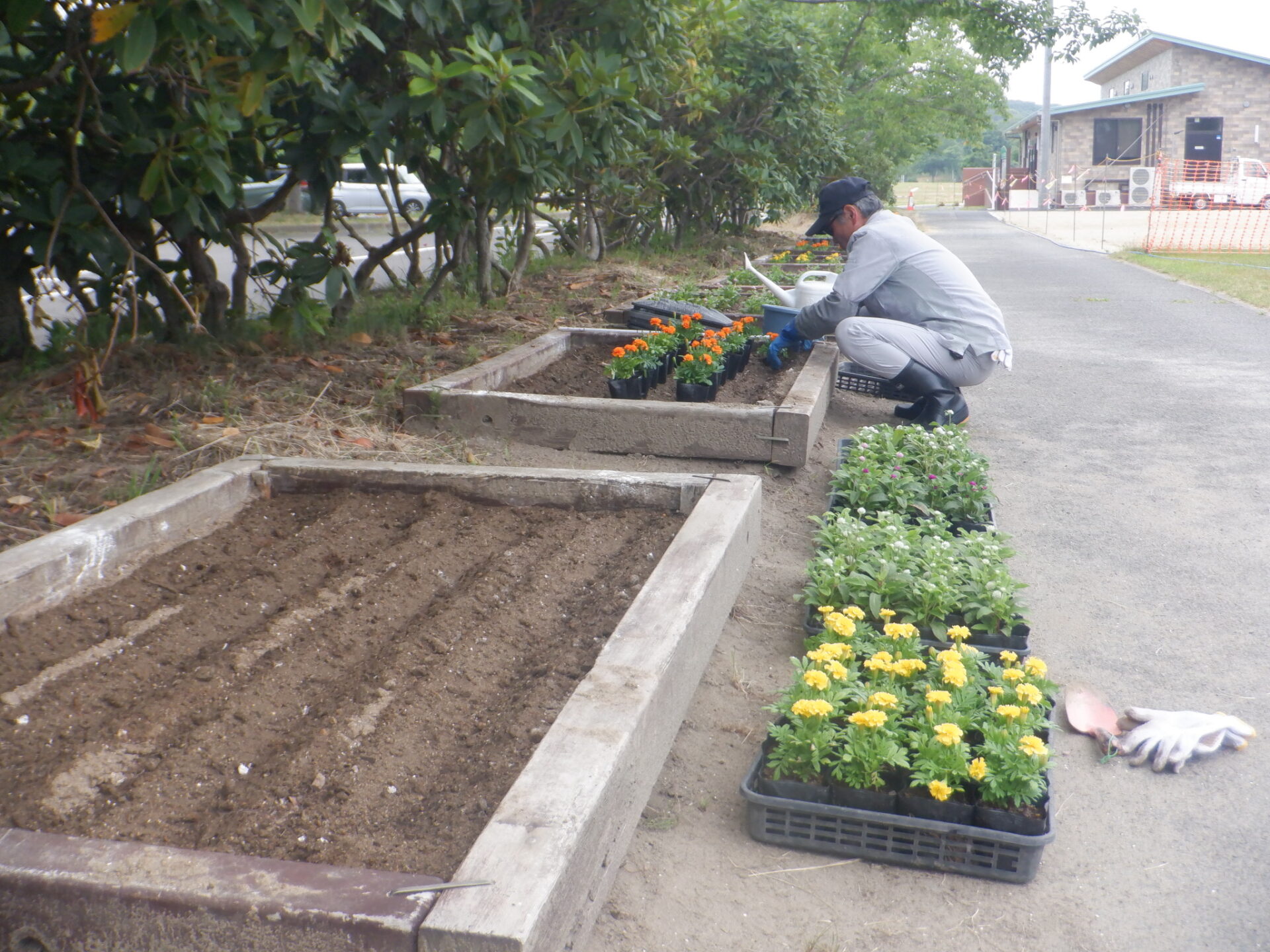 管理棟裏にある花壇にマリーゴールドとイチニチソウの苗を植えました。