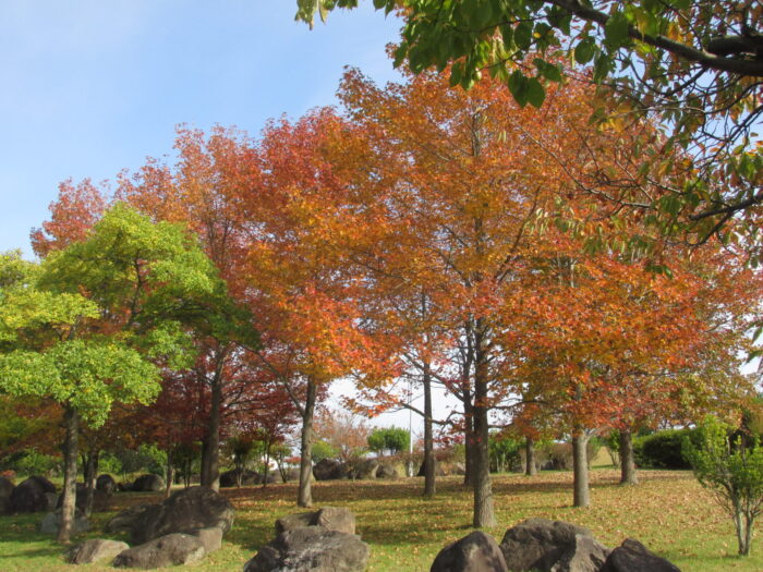 公園の多くの木々が朝夕の冷え込みとともに、緑の葉から赤や黄色に