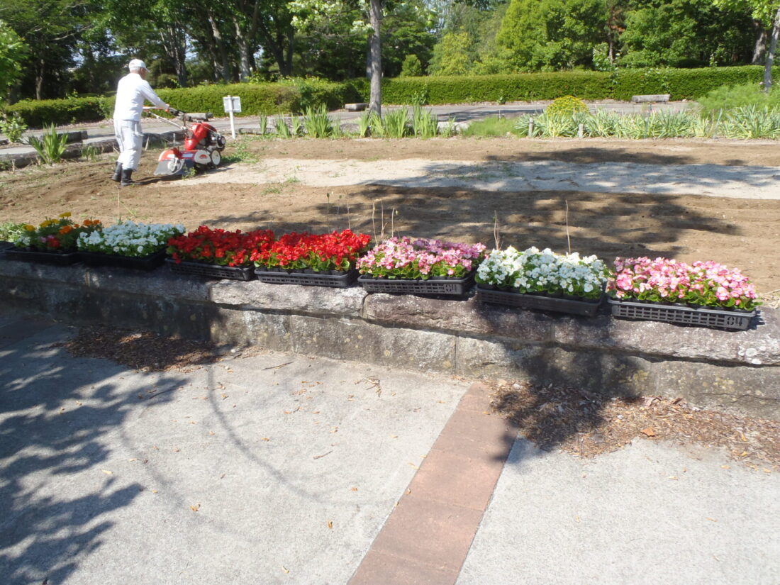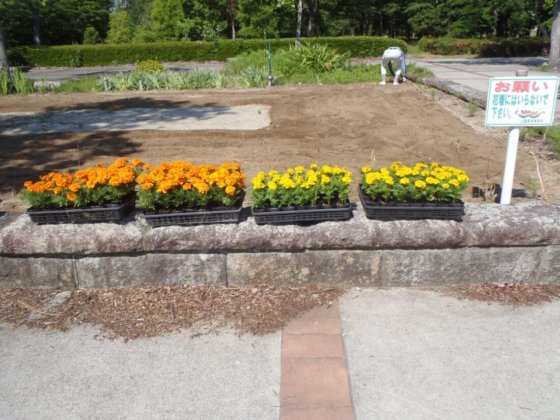 花壇にベコニアとマリーゴールドの苗を植えました。