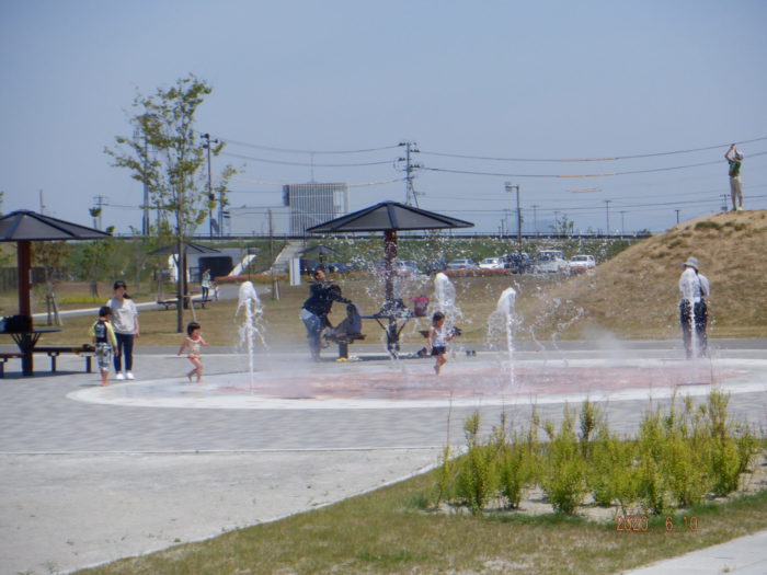 気温が高くなり、海浜緑地公園でも噴水が始まりました。