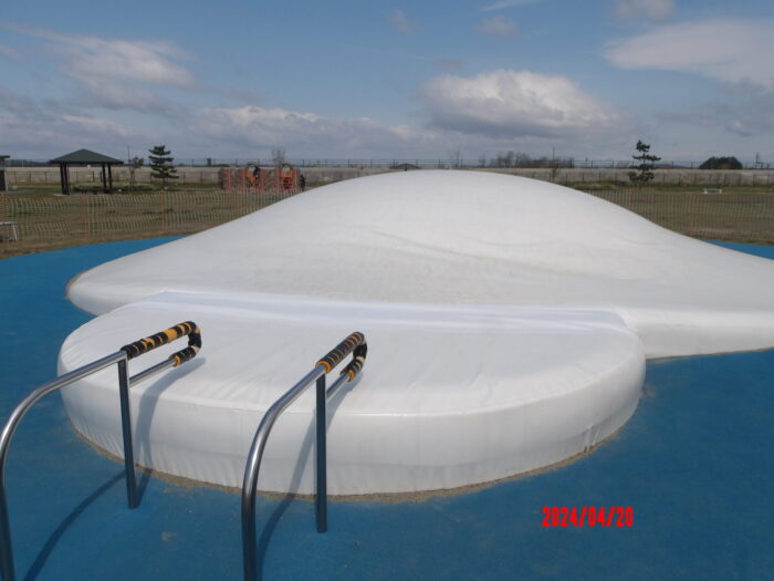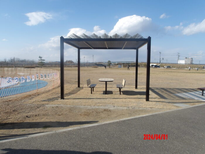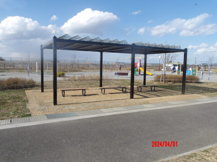 パーゴラの下には遊具広場の方にベンチが3つ、ふわふわドームの隣の方にはインクルーシブ対応のテーブルとベンチが2つ設置しておりますのでご利用ください。
